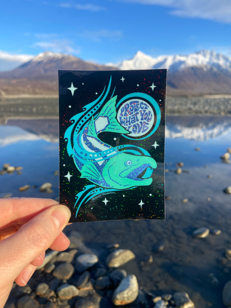 Durable and waterproof, 4" x 3" rectangular sticker with a shimmering stardust finish that makes the colors pop!